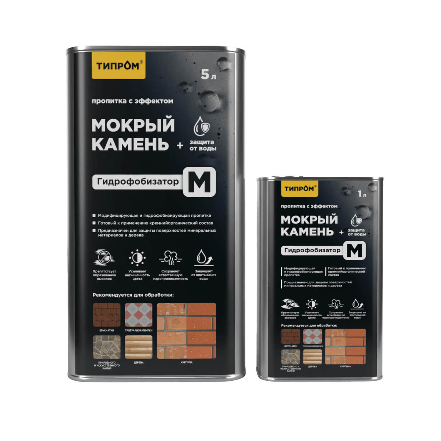 Среди продуктов серии Типром гидрофобизаторами для тротуарной плитки и брусчатки являются составы Типром У и Типром У1, а также Типром М (пропитка с «мокрым эффектом и гидрофобизирующими свойствами»).